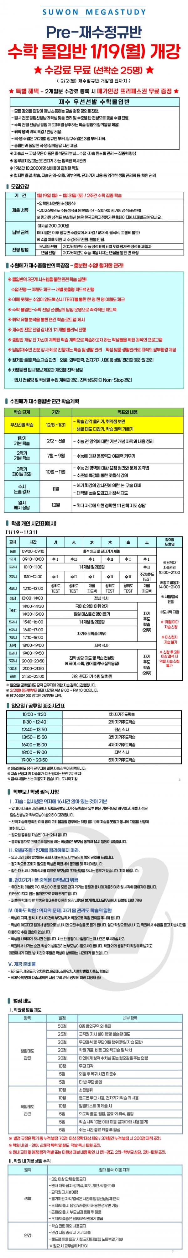 재수 2027 Pre-재수정규반 <수학 몰입반> 개강 페이지 정보 작성자 최고관리자 작성일 26-01-08 10:56 조회 461회 댓글 0건 본문 2027 Pre-재수정규반 <수학 몰입반> 개강