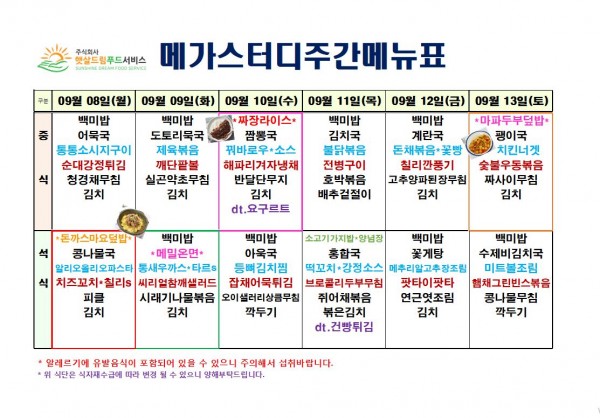 9월 2주차 식단표(9/8~9/13)