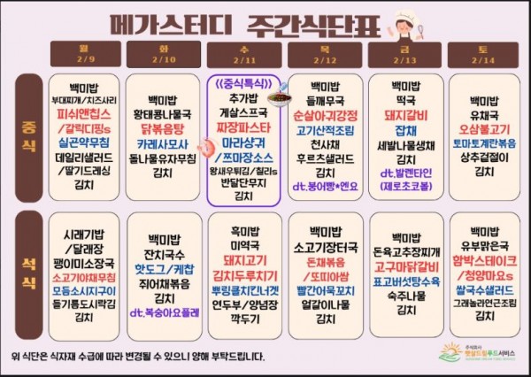 2월 2주차 식단표(2/9~2/14)